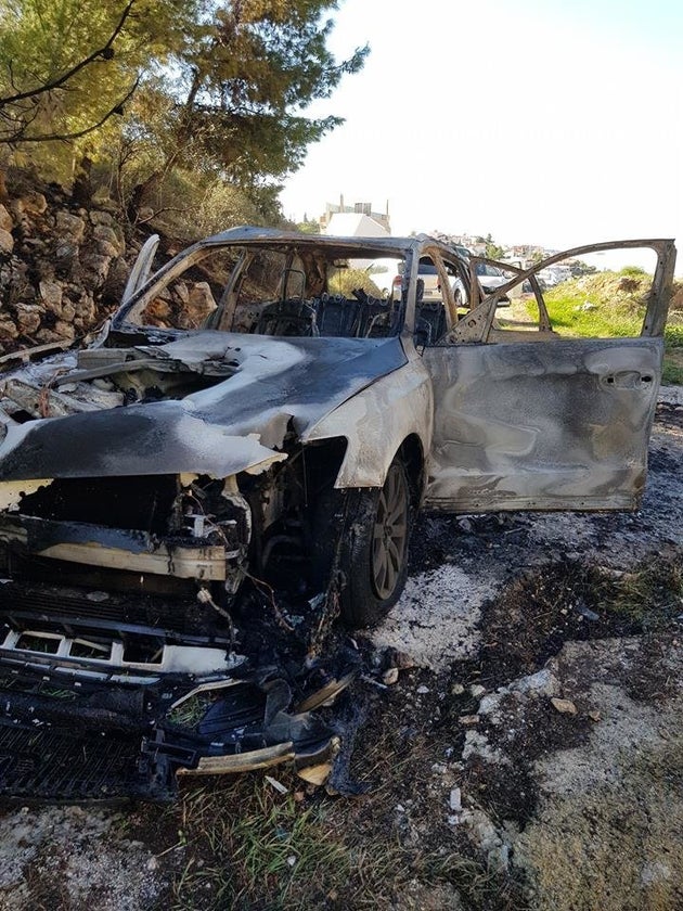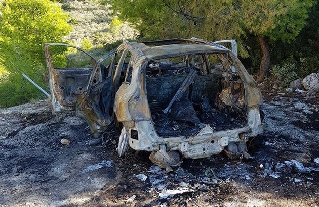 Το καμένο αυτοκίνητο που χρησιμοποίησαν οι «βομβιστές των ΑΤΜ» στη Γλυφάδα