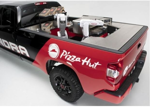 Το κόνσεπτ είναι απλό: πίτσα ολόφρεσκη στην πόρτα σου. Η τεχνολογική υλοποίηση δεν ήταν και τόσο απλή, όμως είναι πλέον γεγονός. Από τη συνεργασία της Pizza Hut με την Toyota προέκυψε το φορτηγάκι της πιτσαρίας που θα παραδίδει ολόφρεσκες πίτσες στην πόρτα του πελάτη, χωρίς μάλιστα να μεσολαβεί ανθρώπινο χέρι, αφού όλη η διαδικασία γίνεται από ένα ρομποτικό χέρι που βρίσκεται στην ειδικά διαμορφωμένη καρότσα του φορτηγού Tundra.