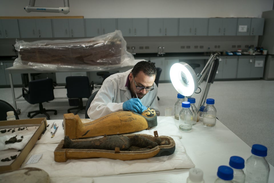 Λίγο αργότερα, καθώς ξεναγούμαστε στο εργαστήριο συντήρησης των κτερισμάτων από τον τάφο του Τουταγχαμών, μία από τις επιστημονικές συνεργάτιδες του δρα Ταουφίκ μας λέει πως όλη η διαδικασία γίνεται με γνώμονα να «παραδοθούν» στο κοινό τα εκθέματα απαλλαγμένα από κάθε τυχόν κακή προηγούμενη παρέμβαση, που μπορεί να έχει αλλοιώσει την αρχική μορφή τους.