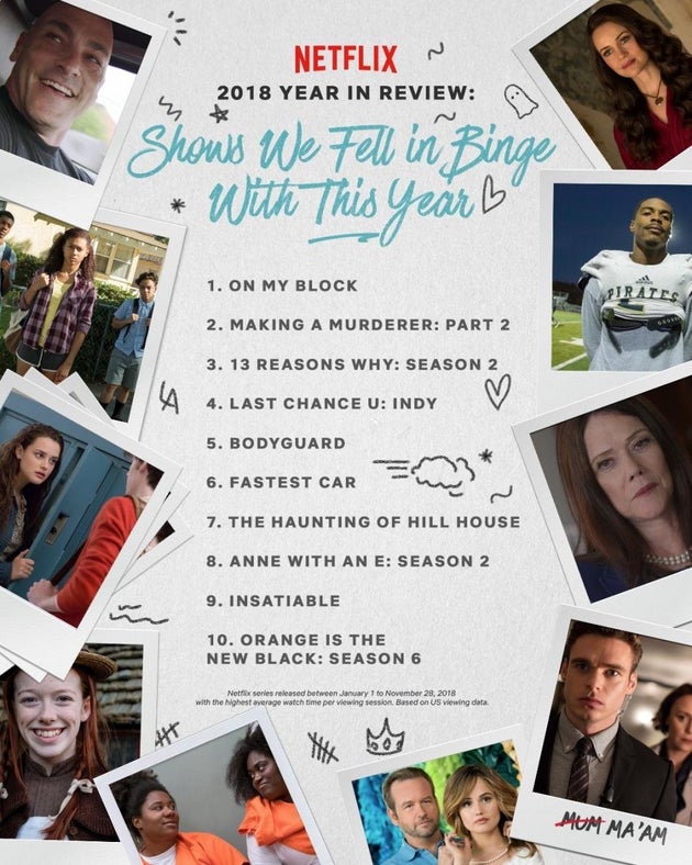 Στις κορυφαίες σειρές, η δειγματολήψία προέρχεται μόνο από τις ΗΠΑ και αφορούν τον υψηλότερο μέσο χρόνο θέασης ανά επίσκεψη. Σύμφωνα με αυτό το κριτήριο λοιπόν, κορυφαία σειρά ήταν το «On My Block» όπου τέσσερις έφηβοι πηγαίνουν Γυμνάσιο σε μια σκληροπυρνηική γειτονιά του Λος Άντζελες. Στη δεύτερη θέση βρίσκεται η συνέχεια του «Μaking a Murderer» και στη τρίτη θέση η δεύτερη σεζόν του «13 Reasons Why», όπου η μητέρα της Χάνα Μπέικερ ζητά δικαιοσύνη για το χαμό του παιδιού της. Οι «Δαίμονες του Χιλ Χάουζ» που έλαβαν εξαιρετικές κριτικές, βρίσκονται στην 7η θέση.