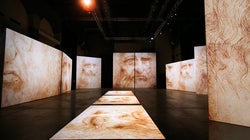 Ο Βιτρούβιος Άνθρωπος, τα μοναδικά μυστηριώδη μάτια της Μόνα Λίζα, ο Μυστικός Δείπνος, η αυτοπροσωπογραφία του Λεονάρντο, απεικονίζονται με την ιδιαίτερη γραφή του εικαστικού καλλιτέχνη ΙΝΟ ο οποίος υπογράφει πολλά εμβληματικά έργα στην πόλη της Αθήνας.