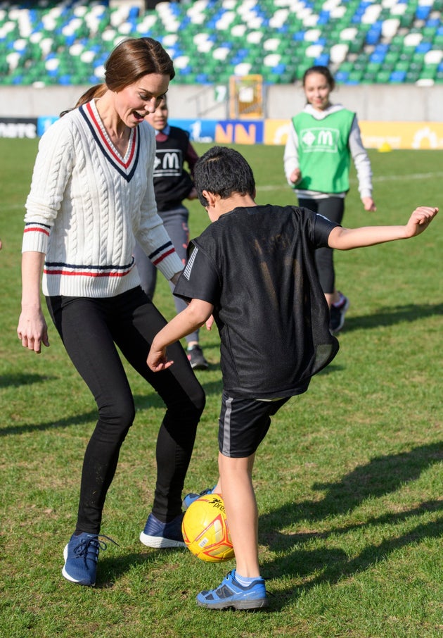 Η Κέιτ Μίντλετον και ο πρίγκιπας Γουίλιαμ στο πλαίσιο διήμερης επίσκεψης - έκπληξης που πραγματοποιούν στη Βόρεια Ιρλανδία, φόρεσαν για λίγο casual ρούχα και αθλητικά παπούτσια και έπαιξαν ποδόσφαιρο με μαθητές στο γήπεδο του Windsor Park.