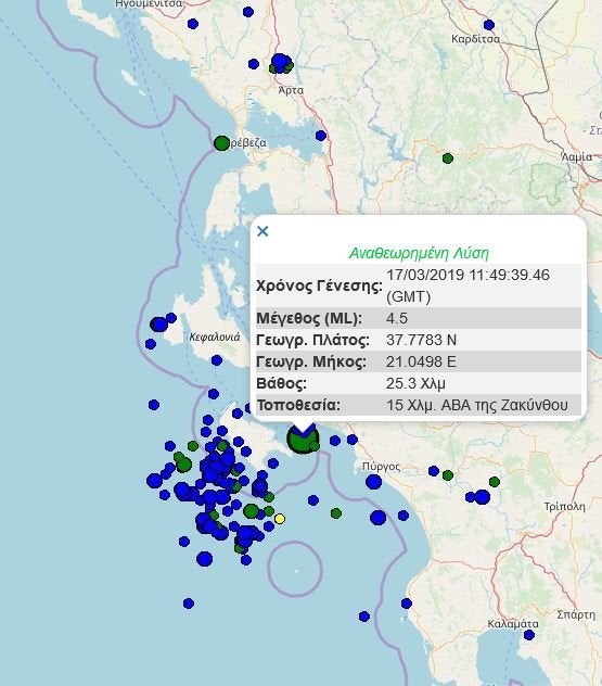 Σεισμός 4,5 βαθμών της κλίμακας Ρίχτερ σημειώθηκε στις 13:49 στη θαλάσσια περιοχή μεταξύ Ζακύνθου και Αμαλιάδας.