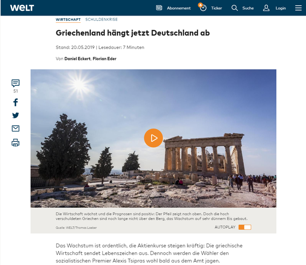 Στη θετική πορεία της ελληνικής οικονομίας στέκεται το άρθρο της Die Welt με τίτλο «Η Ελλάδα αφήνει πίσω της τη Γερμανία».