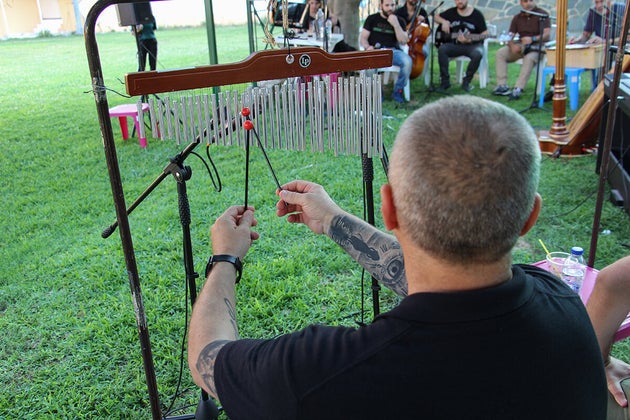 Ζεστό απόγευμα καλοκαιριού- στον τοίχο του κήπου των Φυλακών Κορυδαλλού το γκράφιτι του ήλιου που δύει σε μια εξωτική, παραδεισένια ακτή και απέναντί του τοποθετημένα μουσικά όργανα. Κιθάρες, βιολοντσέλο, άρπα, ξυλόφωνο, πλήκτρα, μεταλλόφωνο, κουρτίνες, θιβετανικό μπολ, ηλεκτρικό μπάσο, καχόν κι άλλα κρουστά. Σύντομα ο χώρος των φυλακών, πλημμύρισε- ‘αντιλάλησε’ όπως έγραψε και ο Μάρκος Βαμβακάρης στο ξακουστό του ρεμπέτικο άσμα- από όμορφα (εκλεπτυσμένα ή θυμωμένα, εντασιακά ή ήπια) ηχοχρώματα. Ένιωθες μια αρμονία να κατακλύζει τη φυλακή, μια ευγένεια ψυχής να διαχέεται στον αέρα, μέχρι τα πρόσωπα και μες στα στήθη.