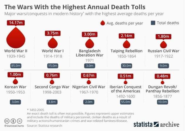 Όπως μπορείτε να δείτε και στο διάγραμμα του statista, στη δεύτερη θέση βρίσκεται ο Πρώτος Παγκόσμιος Πόλεμος ο οποίος κόστισε στο σύνολο τη ζωή 15 εκατομμυρίων ανθρώπων. Ακολουθεί η μάχη για τον απελευθερωτικό πόλεμο του Μπαγκλαντές που άφησε πίσω του 3 εκατομμύρια θύματα και η εξέγερση του Ταϊπίνγκ που συνολικά οδήγησε στο θάνατο 30 εκατομμύρια πολίτες.