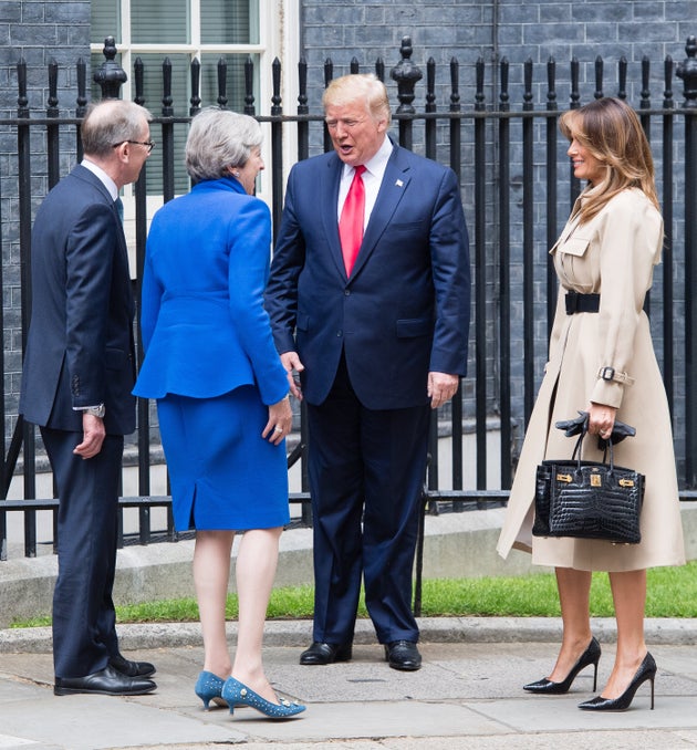 Η Τερέζα Μέι φάνηκε έτοιμη να δώσει το χέρι της στον Αμερικανό πρόεδρο, αλλά το δικό του χέρι παρέμεινε στην θέση του και η συγκεκριμένη χειραψία δεν έγινε. Η Μέι και ο σύζυγός της χαιρέτησαν διά χειραψίας την Μελάνια, αλλά ο Τράμπ έδωσε το χέρι του μόνο στον σύζυγο της Βρετανίδας πρωθυπουργού - και τα βρετανικά ΜΜΕ απέδωσαν την αμηχανία στην ατυχή στιγμή της Δευτέρας, όταν ο Αμερικανός πρόεδρος έδωσε την γροθιά αντί για το χέρι του στην βασίλισσα Ελισάβετ, κατά την υποδοχή του στο παλάτι του Μπάκινγχαμ.