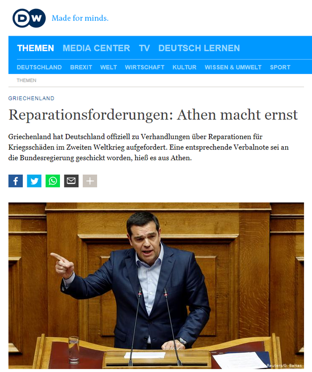 «Η Ελλάδα ζήτησε επίσημα από τη Γερμανία να διαπραγματευτεί το θέμα των πολεμικών επανορθώσεων και αποζημιώσεων για καταστροφές που προκλήθηκαν κατά τη διάρκεια του Δευτέρου Παγκοσμίου Πολέμου. Ανάλογη ρηματική διακοίνωση εστάλη στην ομοσπονδιακή κυβέρνηση», τονίζει η Deutsche Welle.