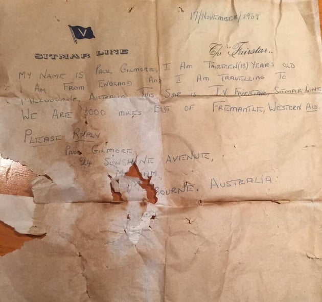 Την ίδια ακριβώς σκέψη φαίνεται ότι είχε κάνει και ο 13χρονος - τότε - Πολ Γκίλμορ, όταν άφηνε ένα γράμμα κλεισμένο μέσα σε μπουκάλι, να ταξιδέψει στον Ινδικό ωκεανό στις 17 Νοεμβρίου 1969.
