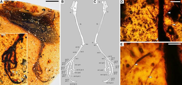 Eνα πτηνό 99 εκατομμυρίων ετών με ένα δάκτυλο μεγαλύτερο από το πόδι του βρέθηκλε απολιθωμένο σε κεχριμπάρι στη Μιανμάρ.