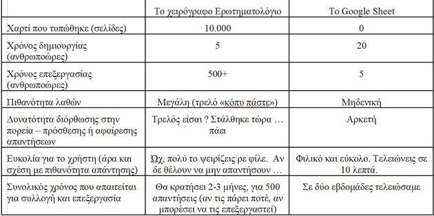 Μόλις έλεγξα πως πάει ένα άλλο ερωτηματολόγιο, που φτιάξαμε με μία συνεργάτη μου, ΦΥΣΙΚΑ ΣΕ ΗΛΕΚΤΡΟΝΙΚΟ ΜΕΣΟ (google forms στην περίπτωση αυτή) για την αξιολόγηση ενός συστήματος του Δημόσιου Τομέα, με χιλιάδες χρήστες. Τι βλέπω, φτάσαμε τις 500 απαντήσεις, σε μία εβδομάδα. Ήδη βλέπω τα ΑΥΤΟΜΑΤΑ παραγόμενα γραφικά, τα αποτελέσματα, τα δημογραφικά, όλα. Μας πήρε βέβαια μία μέρα να το φτιάξουμε και άλλες πέντε να το τρέξουμε πιλοτικά και να το «κουρντίσουμε», αλλά τώρα τρέχει μόνο του.