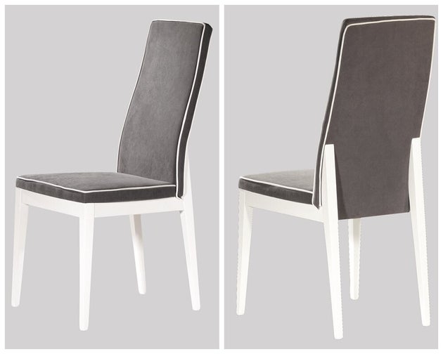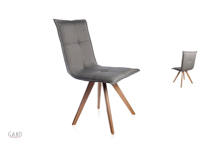 Τραπέζι Marcel από μασίφ ξύλο με εξωτερικά παραλληλόγραμμα πόδια τοποθετημένα στις γωνίες και λευκή καρέκλα δερμάτινη με ίνοξ πόδι.