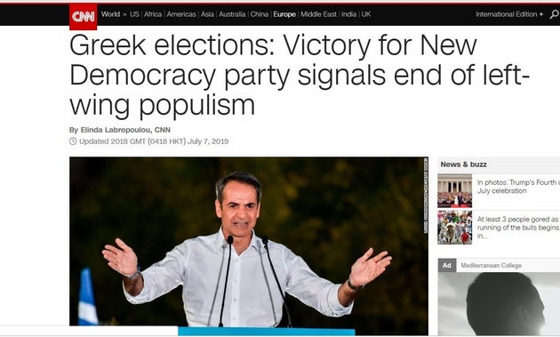 «Η νίκη της ΝΔ σηματοδοτεί το τέλος του αριστερού λαϊκισμού», είναι ο τίτλος ρεπορτάζ του CNN στο οποίο τονίζεται ότι για πρώτη φορά μετά από μια δεκαετία οικονομικής κρίσης κατά την οποία κυβέρνηση εύθραυστες κυβερνήσεις. Μάλιστα γίνεται λόγος για επιστροφή στην κανονικότητα μετά από χρόνια λαϊκισμού. Το εκλογικό αποτέλεσμα μεταφράζεται ως μια πλήρης ανατροπή της τύχης της χώρας «με την επιστροφή σε ένα κόμμα που αποτέλεσε πυλώνα του καθεστώτος περιόδου πριν την οικονομική κρίση. Στο ρεπορτάζ υπάρχουν αναλυτικές αναφορές στο βιογραφικό του κ.Μητσοτάκη, με έμφαση και στο γεγονός ότι είναι γόνος μιας πολιτικής δυναστείας. Επισημαίνεται πως είναι ένας «φιλελεύθερος μεταρρυθμιστής» αλλά επίσης επισημαίνεται πως προέρχεται από το πολιτικό κατεστημένο που βύθισε τη χώρα στην οικονομική κρίση.