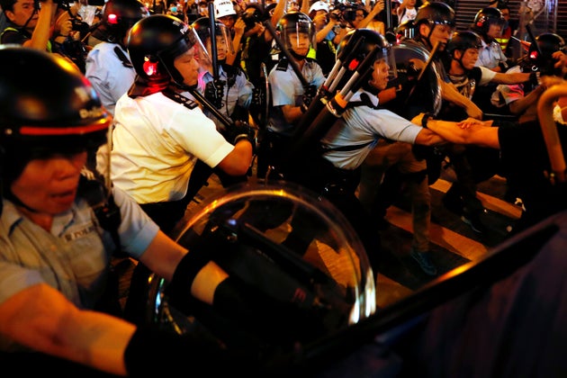 Αργά το βράδυ οι αστυνομικοί επιτέθηκαν σε διαδηλωτές στη συνοικία Μονγκόκ, στο βόρειο τμήμα της πόλης, έπειτα από μια τεταμένη αντιπαράθεση που κράτησε περίπου 20 λεπτά με μια ομάδα περίπου 300 διαδηλωτών, οι περισσότεροι από τους οποίους ήταν νέοι και είχαν καλυμμένα τα πρόσωπά τους.