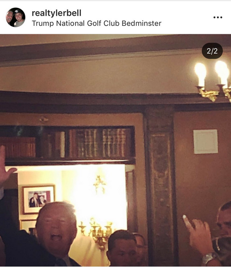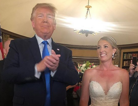 «Ο γαμπρός, η νύφη και οι καλεσμένοι γνώρισαν τον πρόεδρο και την Πρώτη Κυρία Μελάνια Τραμπ, καθώς έτρωγαν στην ιδιοκτησία τους», έγραψε η φωτογράφος του γάμου Τζένιφερ Λαμπ. Ο Τραμπ αγκάλιασε τη νύφη και τον γαμπρό και όλοι μαζί τραγούδησαν και φώναζαν συνθηματικά το «USA! USA!».