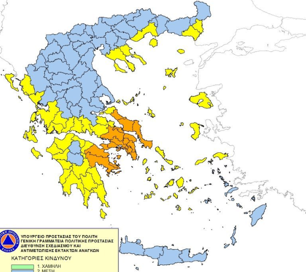 Σύμφωνα με το Χάρτη Πρόβλεψης Κινδύνου Πυρκαγιάς που εκδίδει η Γενική Γραμματεία Πολιτικής Προστασίας του υπουργείου Προστασίας του Πολίτη για την Κυριακή, προβλέπεται πολύ υψηλός κίνδυνος πυρκαγιάς (κατηγορία κινδύνου 4) για τις εξής περιοχές: