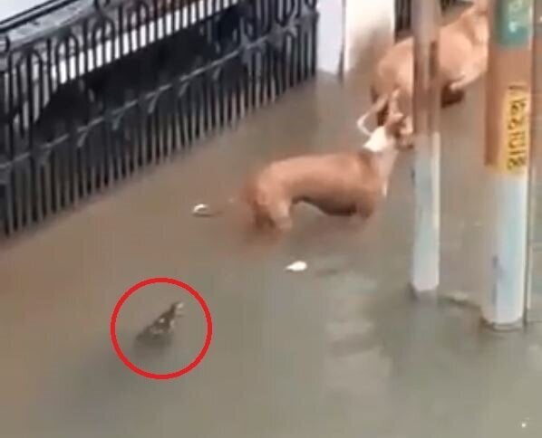 Ινδία: Υπουλος κροκόδειλος επιτίθεται πισώπλατα σε σκυλιά σε πλημμυρισμένο δρόμο