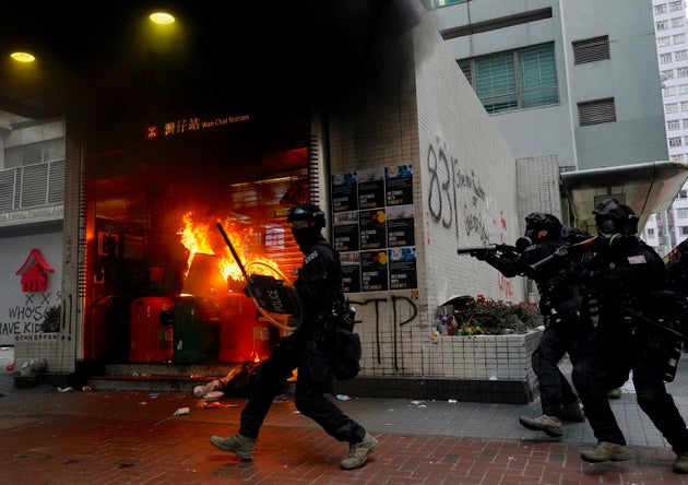 Η αστυνομία το βράδυ του Σαββάτου εκτόξευσε δακρυγόνα και έκανε χρήση αντλιών νερού για να διαλύσει τους διαδηλωτές, που πέταξαν βόμβες μολότοφ και πέτρες, έσπασαν παράθυρα σε κυβερνητικά κτίρια και απέκλεισαν βασική οδική αρτηρία κοντά στο τοπικό αρχηγείο του Λαϊκού Απελευθερωτικού Στρατού της Κίνας.