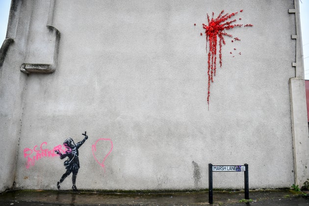 Η τοιχογραφία που απεικονίζει ένα κοριτσάκι να έχει στρέψει τη σφεντόνα του ψηλά στον ουρανό, προς ένα μπουκέτο με κόκκινα τρισδιάστατα λουλούδια που μοιάζει με αστέρι που εκρήγνυται, καταστράφηκε από αγνώστους, οι οποίοι έγραψαν με ροζ σπρέι «BCC wankers» και ζωγράφισαν μία καρδιά.