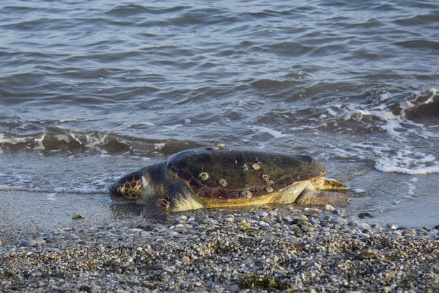Κάποιος έχει ρίξει δίκτυα ψαρέματος τόσα κοντά στα βράχια και τόσο μακριά, ανοιχτά στη θάλασσα, που μια τεράστια χελώνα πιάστηκε και προσπαθούσε να ξεμπλέξει...