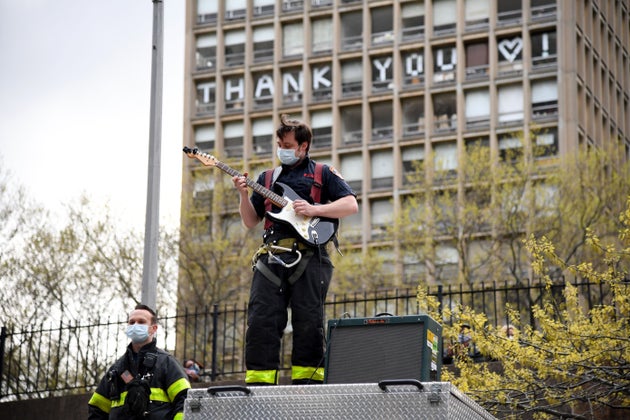 Ο πυροσβέστης Τιμ Μπαρ παίζει το κομμάτι «The Star-Spangled Banner» πάνω στο πυροσβεστικό έξω από το πανεπιστημιακό νοσοκομείο της Νέας Υόρκης την Δευτέρα.