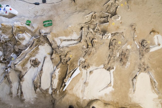 Η πρώτη σειρά αποτελείται από δύο ομάδες δεσμωτών, η μία στη συνέχεια της άλλης. Στην πρώτη ομάδα, η στάση του σώματος διαφέρει και οι σκελετοί φέρουν ακόμα τα μεταλλικά δεσμά τους, ενώ τα άτομα της δεύτερης ομάδας εναποτέθησαν στο σημείο δεμένα πισθάγκωνα χωρίς ωστόσο να φέρουν μεταλλικά δεσμά. Χωρίς μεταλλικά δεσμά σώζονται και οι δεσμώτες της δεύτερης συστάδας, ενώ στην τρίτη συστάδα οι σκελετοί φέρουν σιδηρά δεσμά στους καρπούς των χεριών τους. Το εύρημα χρονολογείται στην ταραχώδη περίοδο του β μισού του 7ου αι. π.Χ.
