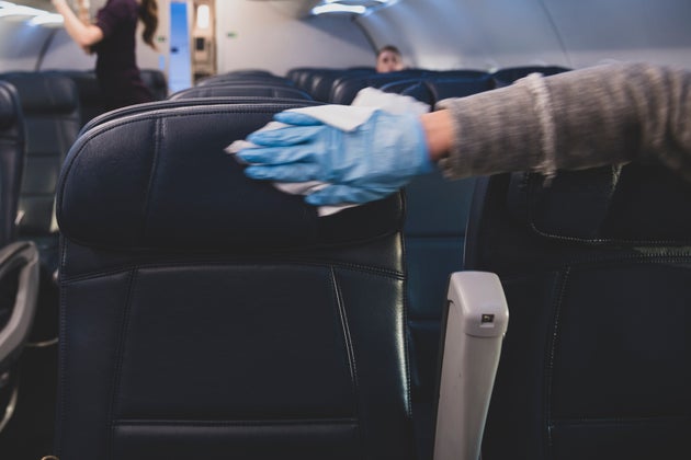 Όταν πάμε να κάτσουμε στη θέση μας και τα χέρια μας είναι καθαρά, μπορούμε να χρησιμοποιήσουμε αντισηπτικά μαντηλάκια και να καθαρίσουμε τις επιφάνειες που θα ακουμπήσουμε όπως τη ζώνη, το τραπεζάκι, τα χερούλια, το προσκέφαλο. Προσοχή όμως, αν καθαρίσουμε το κάθισμα με υγρά μαντηλάκια μπορεί να μεταφέρουμε τον ιό αντί να τον σκοτώσουμε γιατί το κάθισμα παραμένει νωπό.
