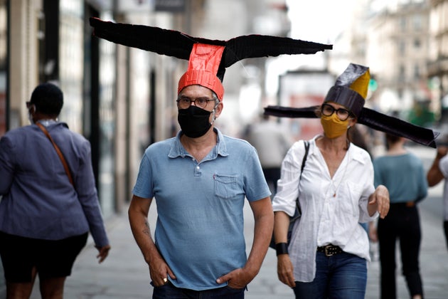 Τα πολύχρωμα καπέλα papier-mâché διαθέτουν επεκτάσεις αρκετά μακρές για να κρατήσουν τους χρήστες ένα μέτρο χωριστά, όπως ορίζεται στους κανονισμούς COVID-19 της Γαλλίας.