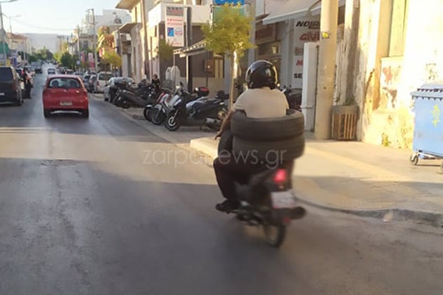 Με το στόμα ανοικτό έμειναν οδηγοί και περαστικοί στο κέντρο των Χανίων μπροστά στο θέαμα ενός δικυκλιστή που είχε «φορέσει» δύο ελαστικά αυτοκινήτου και οδηγούσε ακάθεκτος στους δρόμους της πόλης.