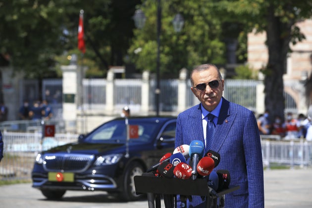 Ο Τούρκος πρόεδρος μίλησε σε δημοσιογράφους μετά τις προσευχές της Παρασκευής στην Αγία Σοφία, η οποία μετετράπη πρόσφατα σε τζαμί, προκαλώντας διεθνείς αντιδράσεις, και στον απόηχο της υπογραφής συμφωνίας για τμηματική οριοθέτηση ΑΟΖ μεταξύ Ελλάδας και Αιγύπτου. Η συμφωνία αυτή προκάλεσε την έντονη αντίδραση της Άγκυρας: Όπως είπε ο Έλληνας υπουργός Εξωτερικών, Νίκος Δένδιας, πρόκειται για μια συμφωνία η οποία στέλνει στον κάλαθο των αχρήστων το παράνομο μνημόνιο που υπέγραψε η Άγκυρα με την κυβέρνηση της Τρίπολης του Φαγέζ αλ Σάρατζ, την οποία η Τουρκία υποστηρίζει στρατιωτικά στον λιβυκό εμφύλιο.