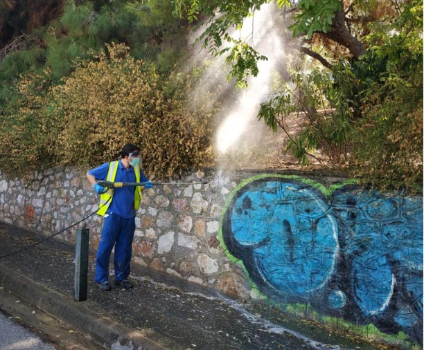 Οπως ενημερώνουν οι άνθρωποί της, για να εξαφανιστούν οι μουτζούρες που σκέπαζαν πέτρινο τοίχο περίπου 100 τ.μ. της περιοχής και να αφαιρεθούν οι μπογιές, χρησιμοποιήθηκαν 50 λίτρα διαλυτικό υγρό και 500 λίτρα νερού με πολύ υψηλή πίεση.