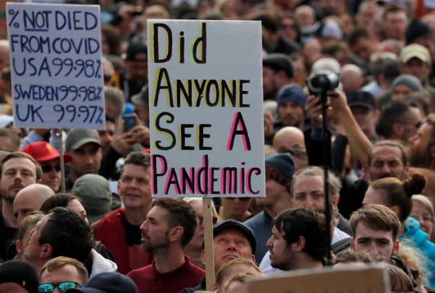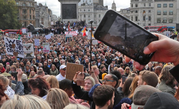 Κρατώντας πινακίδες με συνθήματα όπως «Δεν συναινούμε» και «Όχι στους ηλίθιους κανόνες», χιλιάδες άνθρωποι κατέκλυσαν την Πλατεία Τραφάλγκαρ, για να διαδηλώσουν κατά των νέων περιορισμών.