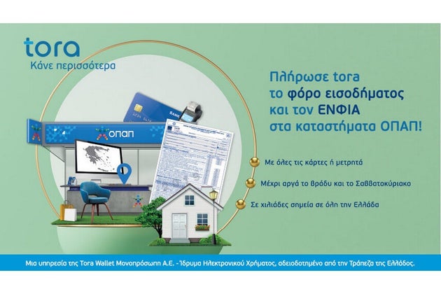 Με άμεση εξυπηρέτηση, χωρίς ουρές και αναμονή, η πληρωμή των δόσεων βεβαιωμένων οφειλών και ρυθμίσεων μπορεί να πραγματοποιηθεί σε συνολικά 3.000 καταστήματα του ΟΠΑΠ σε όλη την Ελλάδα, μέσω της υπηρεσίας πληρωμών της tora Wallet, θυγατρικής εταιρείας του ομίλου ΟΠΑΠ. Μέσω αυτής πραγματοποιείται, επίσης, μια ευρύτατη γκάμα πληρωμών που καλύπτει συνολικά περισσότερους από 200 λογαριασμούς (Ενέργεια, Ύδρευση, Ασφάλειες, Τηλεπικοινωνίες, καθώς και οφειλές προς το Δημόσιο και τους Δήμους).
