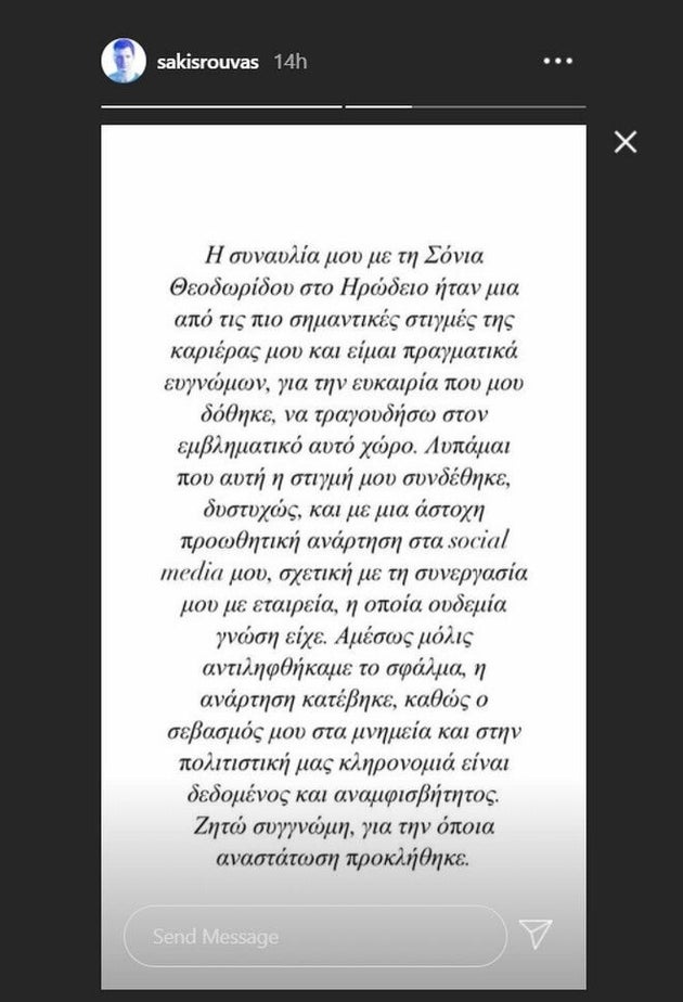 «Η συναυλία μου με τη Σόνια Θεοδωρίδου στο Ηρώδειο ήταν μία από τις πιο σημαντικές στιγμές της καριέρας μου και είμαι πραγματικά ευγνώμων, για την ευκαιρία που μου δόθηκε να τραγουδήσω στον εμβληματικό αυτό χώρο. Λυπάμαι που αυτή η στιγμή μου συνδέθηκε, δυστυχώς, και μία άστοχη προωθητική ανάρτησή μου στα social media μου, σχετική με τη συνεργασία μου με εταιρεία η οποία ουδεμία γνώση είχε. Αμέσως μόλις αντιληφθήκαμε το σφάλμα, η ανάρτηση κατέβηκε, καθώς ο σεβασμός μου στα μνημεία και στην πολιτιστική μας κληρονομιά είναι δεδομένος και αναμφισβήτητος. Ζητώ συγγνώμη, για την όποια αναστάτωση προκλήθηκε», έγραψε ο Σάκης Ρουβάς στο instagram.