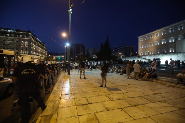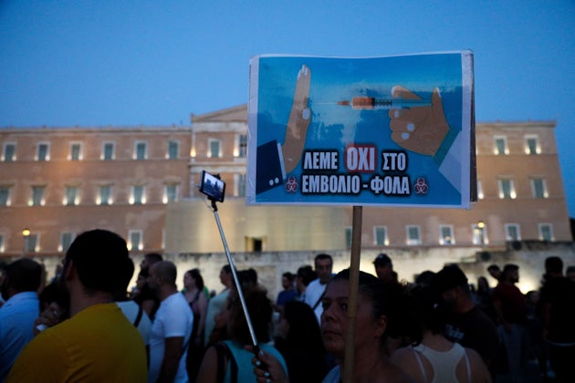 Δεκάδες άτομα που εναντιώνονται στη χρήση μάσκας και τάσσονται κατά του εμβολίου συγκεντρώθηκαν στην πλατεία Συντάγματος και φώναξαν συνθήματα όπως «Λέμε όχι στο εμβόλιο - φόλα».