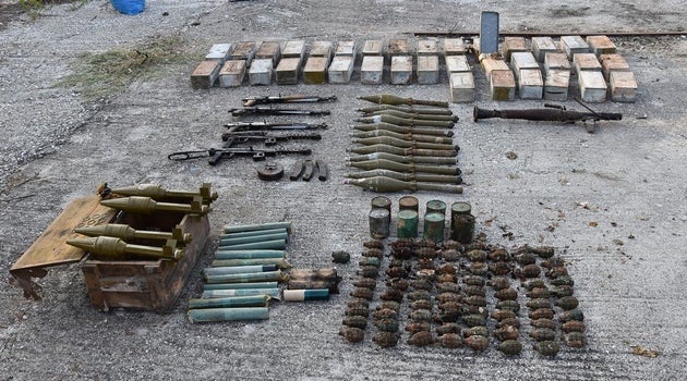 Η Αστυνομία έδωσε στη δημοσιότητα βίντεο και φωτογραφίες από το οπλοστάσιο, που περιλαμβάνει αντιαρματικό ρουκετοβόλο με 16 κεφαλές, 2 υποπολυβόλα, 3 Καλάσνικοφ, 79 αμυντικές χειροβομβίδες και 25.920 φυσίγγια.