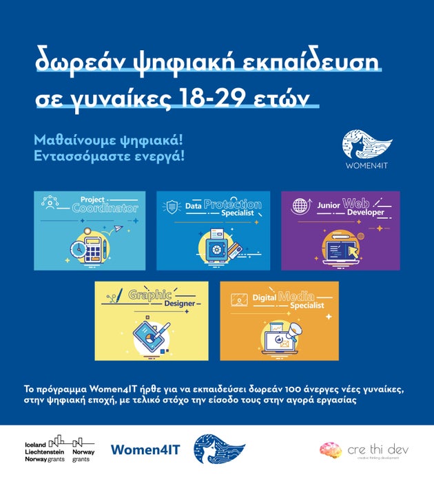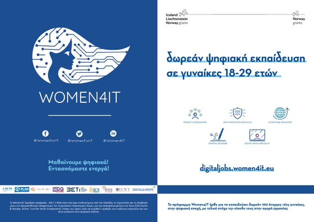 Το «Women4IT» είναι εδώ για να δώσει ψηφιακή τεχνογνωσία και τεχνολογικές δεξιότητες σε 100 νέες γυναίκες, ηλικίας 18-29 ετών, σε 70 από τις οποίες θα εξασφαλίσει και το εισιτήριο στην αγορά εργασίας. Η εκπαίδευση είναι δωρεάν για όλες, στα ελληνικά και εξειδικεύεται στους τομείς: Διαχείριση έργων (project coordinator), Ασφάλεια δεδομένων (data protection specialist), Κατασκευή ιστοσελίδων (web developer), Γραφιστική (graphic designer), Διαχείριση μέσων κοινωνικής δικτύωσης (digital media specialist).