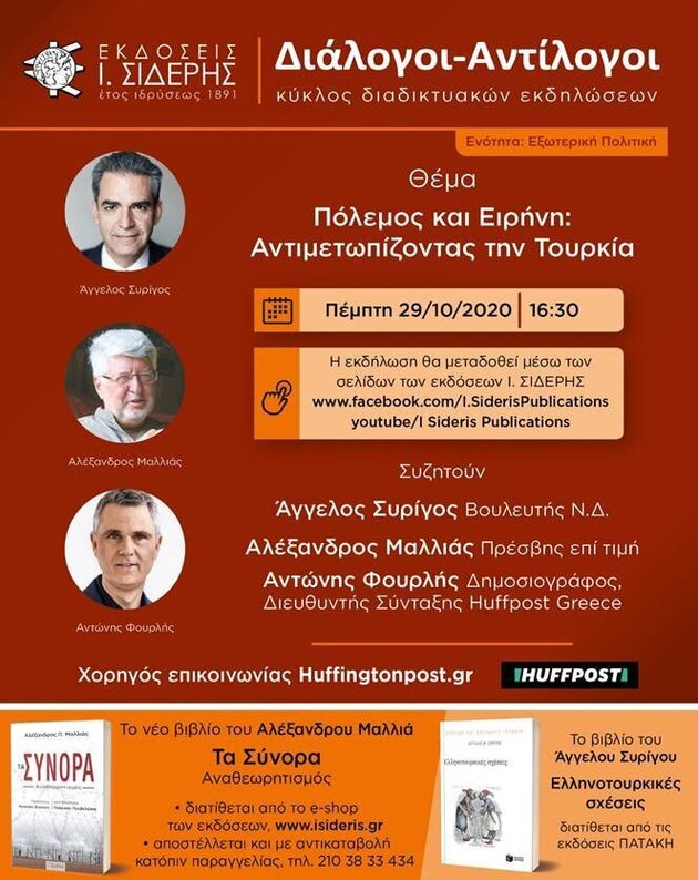 Παρακολουθήστε την Πέμπτη 29/10/2020 στις 16:30 σε ζωντανή διαδικτυακή μετάδοση την συζήτηση μεταξύ του Πρέσβη επί τιμή Αλέξανδρου Μαλλιά, του Βουλευτή της Ν.Δ. Άγγελου Συρίγου και του Διευθυντή Σύνταξης της Huffpost Αντώνη Φουρλή με θέματα προς συζήτηση και ανάλυση, τις ελληνο-τουρκικές σχέσεις, την αναθεωρητική πολιτική της Τουρκίας, τη διαφαινόμενη ρήξη του Ερντογάν με τη Δύση και τον νέο κύκλο αντιπαράθεσης που άνοιξε με τη Γαλλία, τις εξελίξεις στην Κύπρο, αλλά και τις ευρύτερες γεωπολιτικές ανακατατάξεις που βρίσκονται σε εξέλιξη και αναπόφευκτα μας επηρεάζουν.