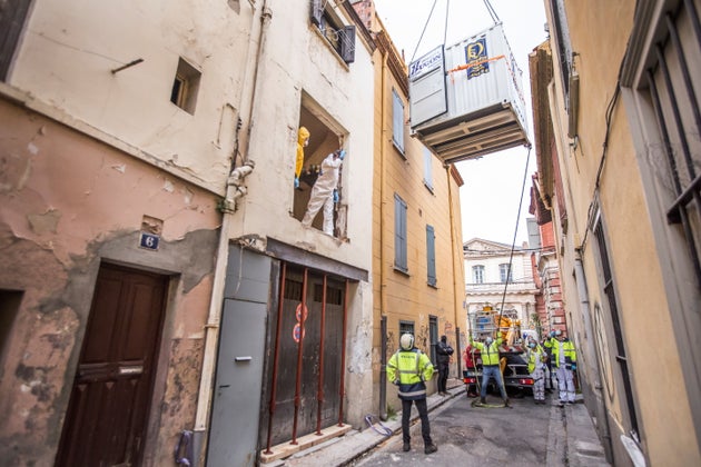 Ο Αλαίν Π. μεταφέρθηκε από το διαμέρισμά του με τη βοήθεια ενός μεγάλου κοντέινερ, αφού εργάτες κατεδάφισαν την πρόσοψη για να μπορέσουν να αποκτήσουν πρόσβαση, χρησιμοποιώντας παράλληλα ένα φουσκωτό στρώμα για να τον σηκώσουν.