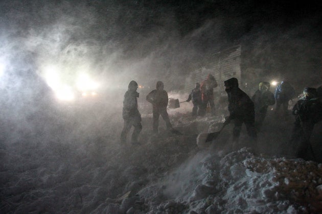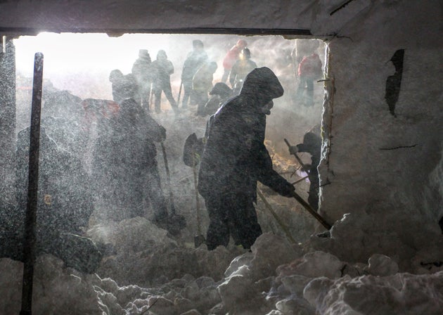 Σε βίντεο που αναρτήθηκαν σε ιστοτόπους κοινωνικής δικτύωσης, διασώστες και εθελοντές αγωνίζονται όλη τη νύχτα υπό αντίξοες συνθήκες και ενώ επικρατούν ισχυροί άνεμοι, να φτάσουν στα κτίρια που θάφτηκαν κάτω από τόνους χιόνι και πάγο.