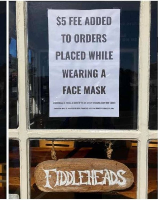 Σύμφωνα με ρεπορτάζ του NBC, ο ιδιοκτήτης του Fiddlehead’s Cafe στην κοινότητα Μεντοσίνο στην πολιτεία της Καλιφόρνια, τοποθέτησε πινακίδες με τις οποίες ενημερώνει τους πελάτες πως θα υπάρχει χρέωση 5 δολαρίων σε όσους επιλέγουν να φορούν μάσκα μέσα στο κατάστημα καθώς και για όσους διτυμπανίζουν πως έκαναν το εμβόλιο κατά του κορονοϊού.