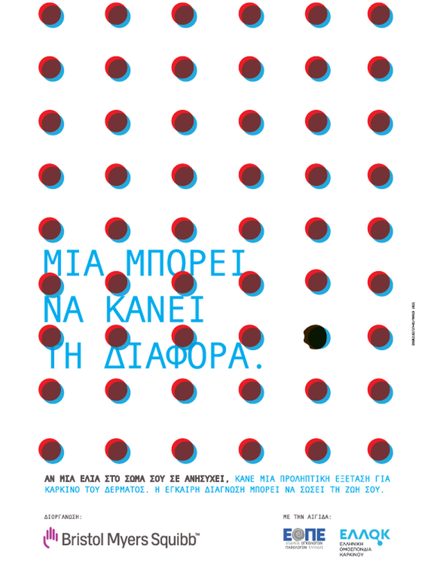 Τελώντας υπό τις αιγίδες της Ένωσης Ογκολόγων Παθολόγων Ελλάδας (ΕΟΠΕ) και της Ελληνικής Ομοσπονδίας Καρκίνου (ΕΛΛΟΚ), η καμπάνια απευθύνεται σε όλες τις ηλικιακές ομάδες και έχει ως στόχο να ευαισθητοποιήσει το κοινό σε ζητήματα που αφορούν στην πρόληψη του καρκίνου του δέρματος και τον σημαντικό ρόλο που διαδραματίζει η έγκαιρη διάγνωση στην πρόγνωση της νόσου. Παράλληλα, επιδιώκει να λειτουργήσει ως υπενθύμιση για τον απαραίτητο ετήσιο προληπτικό έλεγχο σπίλων, γιατί μία ελιά μόνο, μπορεί να κάνει τη διαφορά! Πολύτιμος σύμμαχος σε αυτή την προσπάθεια είναι ο ειδικός δερματολόγος, με την επιστημονική καθοδήγηση και συμβολή του οποίου μπορούμε έγκαιρα και αποτελεσματικά να αντιμετωπίσουμε την πιθανότητα εμφάνισης καρκίνου του δέρματος.