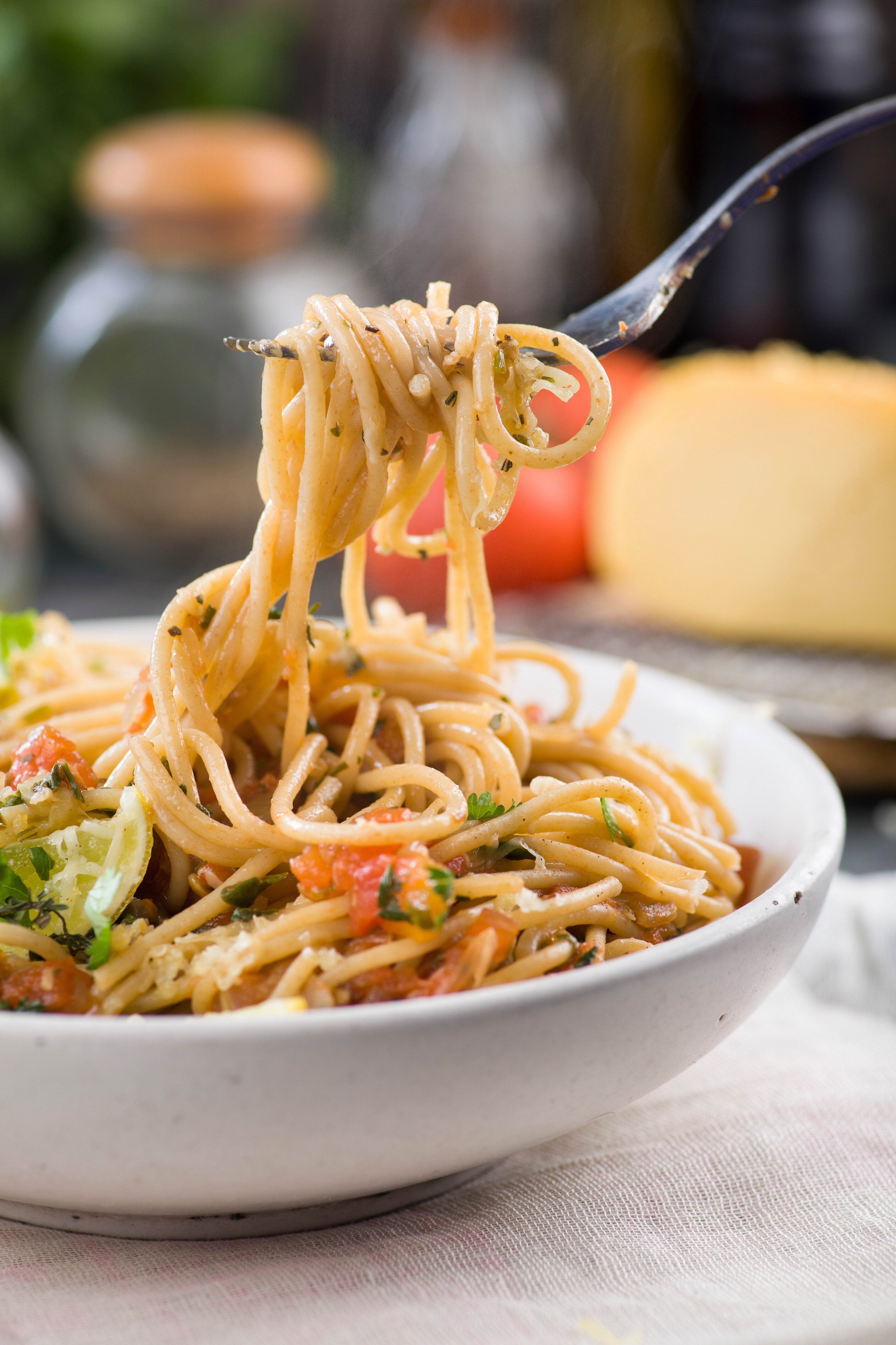 Μόλις τα ζυμαρικά μας είναι έτοιμα, επαναφέρουμε το τηγάνι με την πανσέτα και το σκόρδο στην φωτιά, και με ένα πιρούνι, ρίχνουμε σε δόσεις τα ζυμαρικά. Δεν πετάμε το νερό από τα ζυμαρικά.