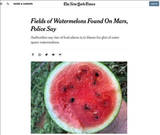 «Χωράφια με καρπούζια ανακαλύφθηκαν στον Άρη, σύμφωνα με την αστυνομία» ήταν ο τίτλος του άρθρου, που δημοσιεύθηκε στον ιστότοπο Futurism και έφερε την υπογραφή του συντάκτη, «Νάτην Φάτην».