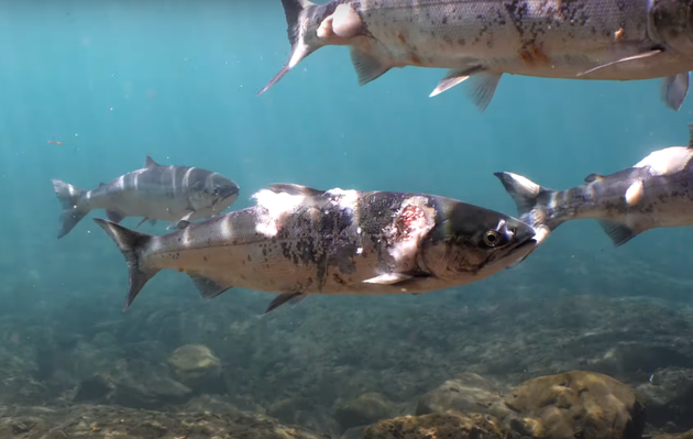 Το υποβρύχιο βίντεο που ανέβασε η μη κερδοσκοπική οργάνωση που εργάζεται για την προστασία των υδάτινων οδών, Columbia Riverkeeper δείχνει πολλούς σολομούς με μεγάλα σημάδια και ανοιχτές πληγές να κολυμπούν στον ποταμό Little White Salmon της πολιτείας Ουάσινγκτον κοντά στο φαράγγι του ποταμού Κολούμπια στις 16 Ιουλίου.
