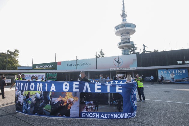 Συμβολική διαμαρτυρία έξω από την κεντρική είσοδο του Διεθνούς Εκθεσιακού Κέντρου της Θεσσαλονίκης, πραγματοποίησαν μέλη της Ενωσης Αστυνομικών Υπαλλήλων Θεσσαλονίκης, το πρωί του Σαββάτου, με αφορμή τα εγκαίνια της 85ης ΔΕΘ.