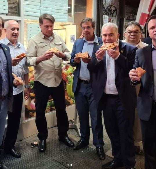 Δυο υπουργοί που τον συνοδεύουν ανάρτησαν φωτογραφίες του Μπολσονάρο και των βοηθών του να τρώνε πίτσα σε ένα πεζοδρόμιο του Μανχάταν, το βράδυ της Κυριακής. «Πολυτελές δείπνο στη Νέα Υόρκη», έγραψε ο υπουργός Προεδρίας, Λουίς Εντουάρντο Ράμος.
