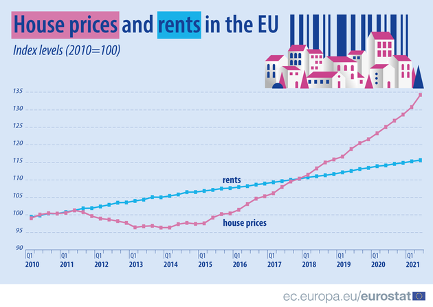 Τα ενοίκια και οι τιμές των κατοικιών στην ΕΕ συνέχισαν σταθερά την αυξητική τους τάση και το β′ τρίμηνο του 2021, σημειώνοντας αύξηση κατά 1,3% και 7,3% αντίστοιχα, σε σύγκριση με το β′ τρίμηνο του 2020, σύμφωνα με τα στοιχεία της Eurostat που δημοσιεύθηκαν σήμερα. Η αύξηση είναι ακόμα μεγαλύτερη εάν συγκρίνουμε τις τιμές με τα επίπεδα του 2010, αφού η αύξηση στα ενοίκια έφτασε το 16% και στις τιμές των κατοικιών στο 34%. Στην Ελλάδα η εικόνα είναι διαφορετική αφού οι τιμές των κατοικιών υποχώρησαν κατά 28% από το 2010, ενώ οι τιμές ενοικίασης εμφανίζονται μειωμένες κατά 25%. Μάλιστα πρόκειται για τις μεγαλύτερες μειώσεις σε ολόκληρη την ΕΕ.