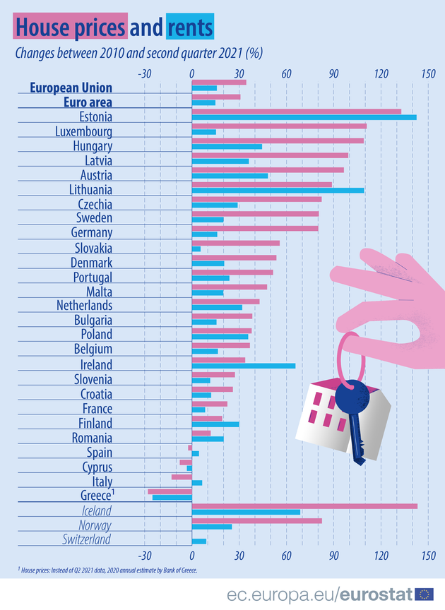 Στα ενοίκια, από το 2010, οι τιμές αυξήθηκαν σε 25 κράτη μέλη της ΕΕ και μειώθηκαν σε δύο, με τις μεγαλύτερες αυξήσεις στην Εσθονία (+142%), τη Λιθουανία (+109%) και την Ιρλανδία (+66%). Μειώσεις καταγράφηκαν στην Ελλάδα (-25%) και την Κύπρο (-3%).
