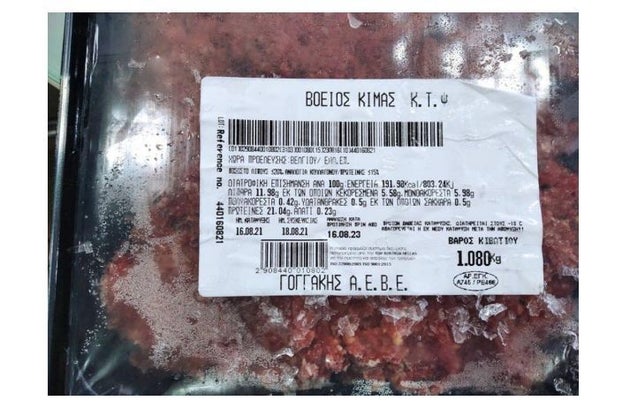 Β) «βόειος κιμάς κτψ, προέλευσης Βελγίου, Ελλην. επεξεργασίας», με ημερομηνία συσκευασίας 18.08.21 και ημερομηνία ανάλωσης «κατά προτίμηση πριν από 16.08.23», βάρους 1 kg περίπου.